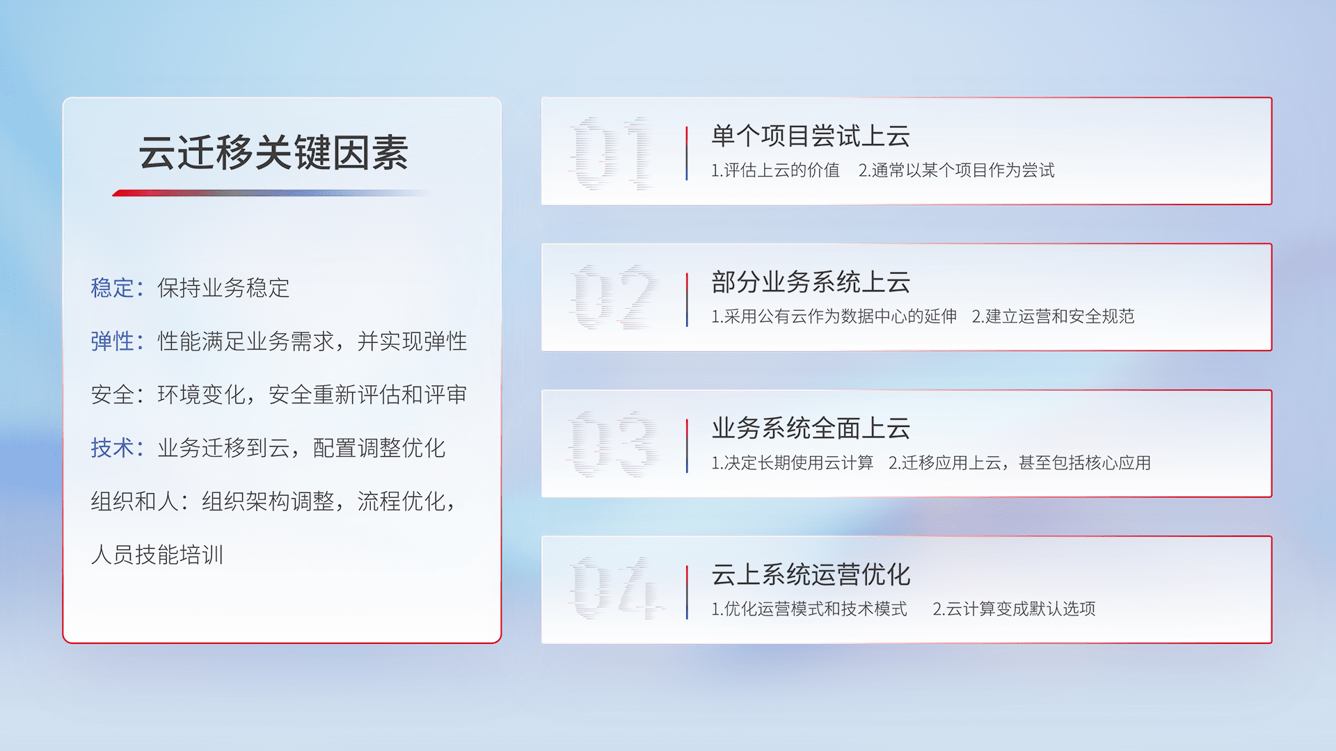 结合实际业务,,,,从规划设计、、、、云平台选型、、、、云原生改造、、、数据迁移、、、集成交付,,,,迁移全过程为客户识别最佳上云路径,,,做好风险识别管理,,,设计网络架构、、身份权限、、、安全审计合规、、、、操作审计、、、、日志审计、、监控告警策略、、、、多站点容灾设计等,,,对云上基础设施进行整体规划,,,,提升IT治理水平,,以满足弹性、、、高可用、、高性能的需求。。