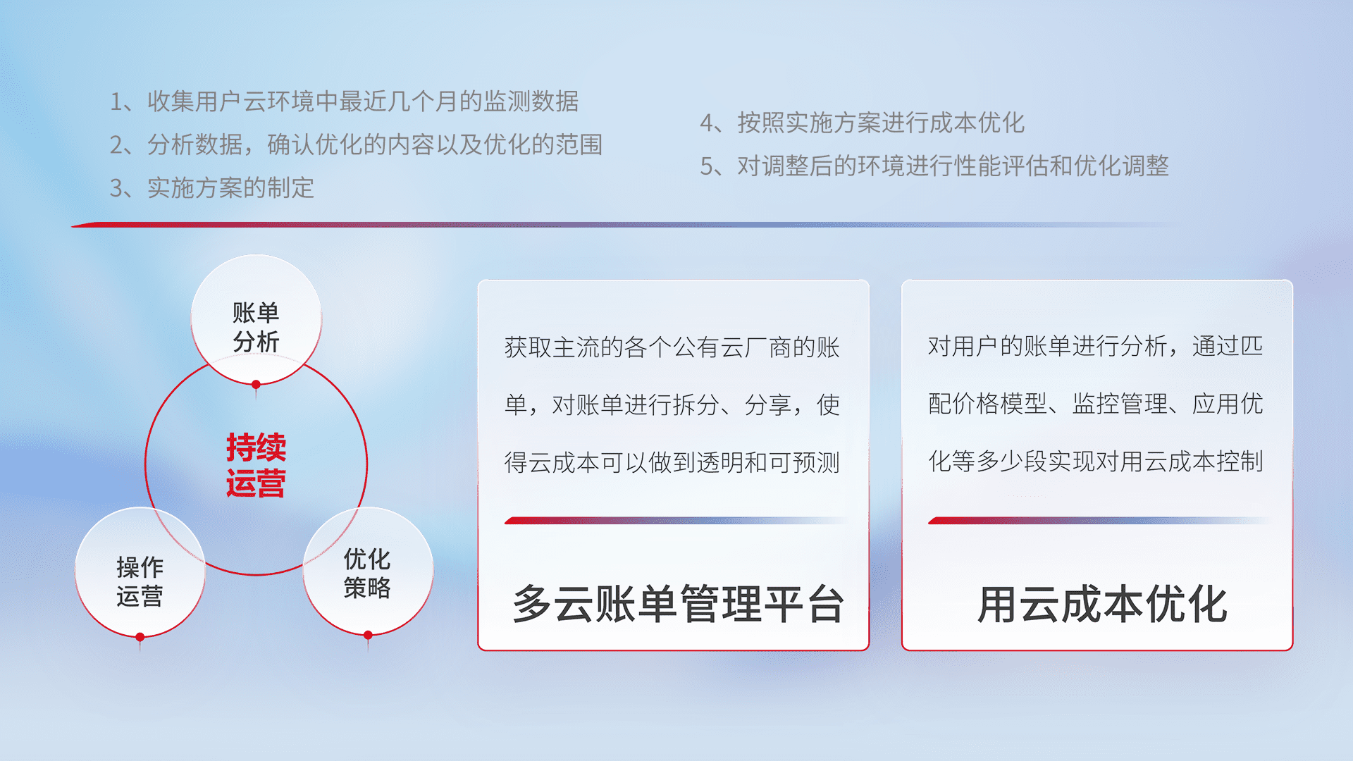 通过多云纳管,,以统一的资源数据模型把客户的云资源进行抽象和封装,,进而实现对多云资源的统一操作,,,保障云资源管理的可靠性、、、稳定性与可用性。。量身定制化运维内容,,,配置、、、开发运维、、、、补丁管理、、备份、、、、监控、、认证和访问管理、、、、审计和日常巡检等,,,保障在用云过程中的可靠度,,,,稳定度以及高可用率。。。