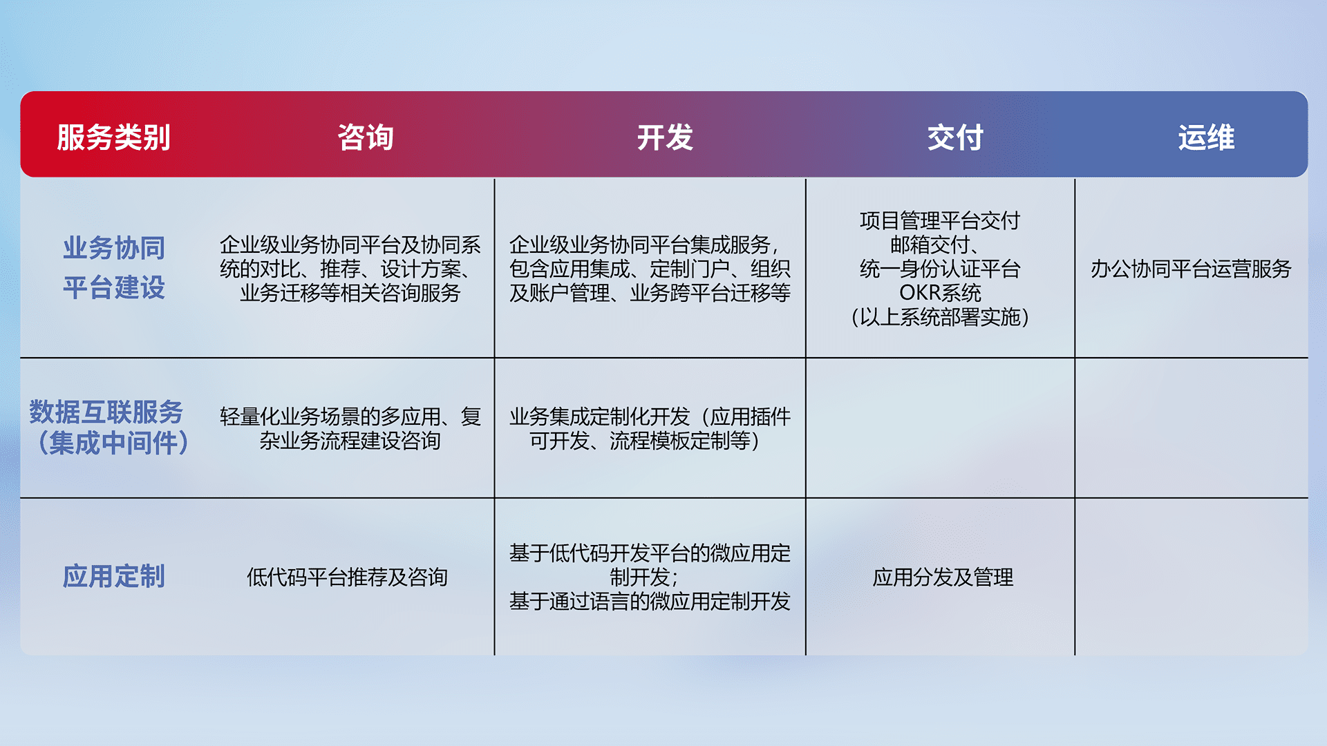 针对钉钉、、、企微、、、IDaas等平台级产品提供产品的规划、、方案、、、、交付、、、、定制化开发等服务,,,,实现如统一协同办公、、、智能客户服务、、、混合会议管理、、、智能数据查询、、等业务场景,,,,实现数字化转型。。。。